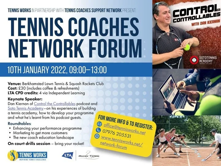 Early on in my journey as a Tennis Coach, I joined the Tennis Coaches’ Support Network - a Facebook Group for tennis coaches. It didn’t take me long to realise that is was going to be a really helpful resource for learning and a fantastic place to meet coaches around the UK. During lockdown the webinars and catch ups were so useful at a time when no tennis was possible. The Group is run by a tennis coach called Jonty Solomons. In this episode, we hear about Jonty’s journey to becoming a Coach, how and why he started the Tennis Coaches’ Support Network and all about an exciting new Tennis Coaches Network Forum that Jonty and John Cavill are hosting on 10 January 2022. The forum will feature a keynote presentation from Dan Kiernan from the exacellent Control The Controllables podcast.