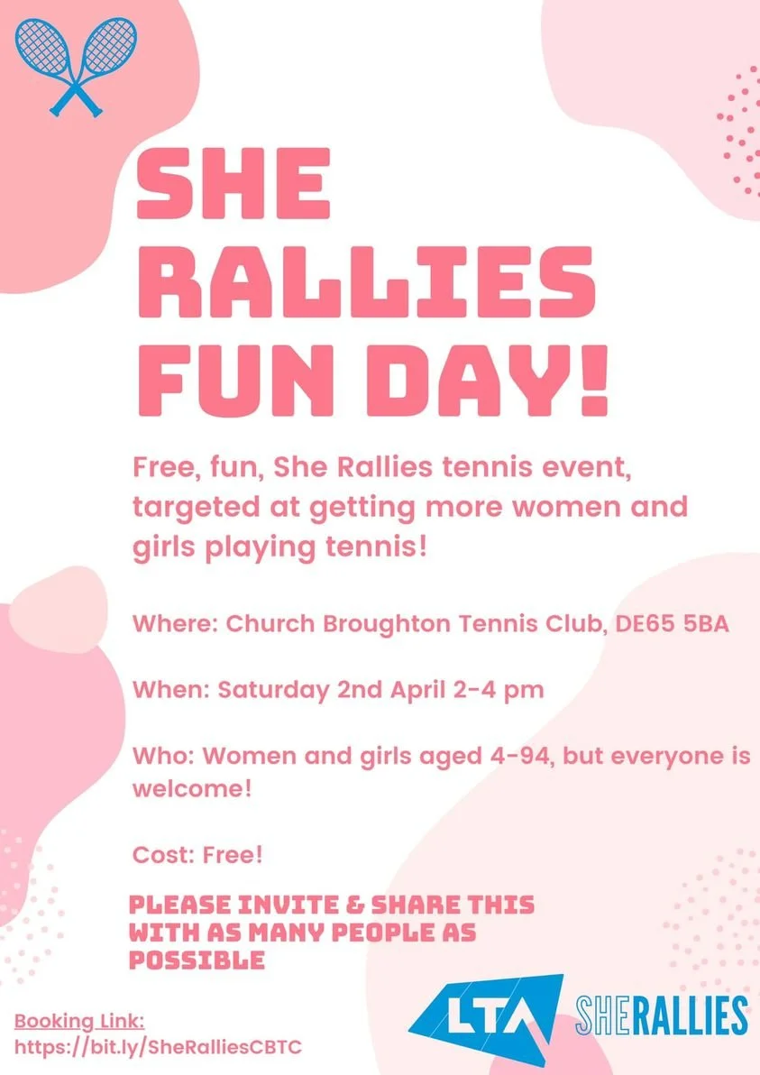 We’d love to. see you at the She Rallies Fun Day at Church Broughton Tennis Club